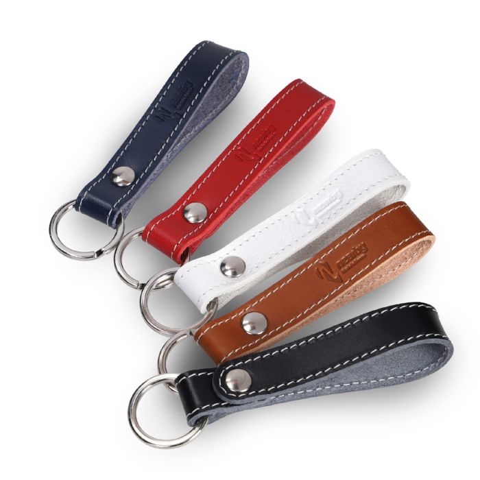 En stilren nyckelring i läder med metallnit och metallring. Med måtten 90 x 20 mm är den både praktisk och elegant – en liten detalj som gör stor skillnad. Välj bland fem olika läderfärger och förädla den med prägling (embossing) för en personlig touch.