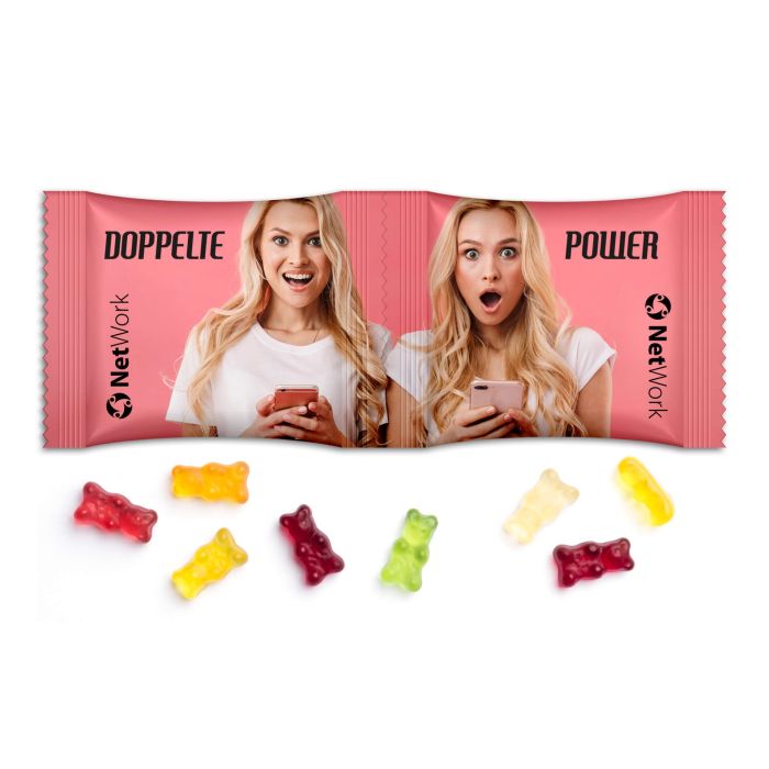 Smidigt, delbart och effektfullt. Sweet Pair är våra gelégodisnallar med eget tryck som levereras som två små påsar à 5 g, sammanlänkade med perforering – perfekt att dela med en vän eller kollega. Utfallande fullfärgstryck på båda påsarna ger dig stora möjligheter att designa din egna godispåse efter tycke, smak och grafisk profil.