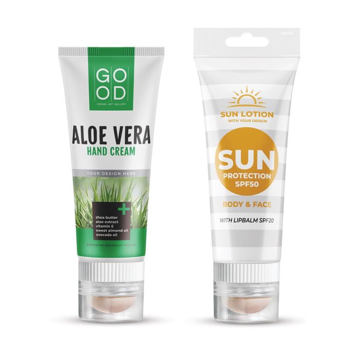 En unik profilprodukt som kombinerar hudvård och solskydd i ett smart format. Tuben rymmer 20 ml och i den nedre delen finns ett separat läppcerat med SPF20. Den övre delen kan fyllas med antingen handkräm eller solkräm (SPF30 eller SPF50). Hela tuben trycks i fullfärg runt om och kan även fås med eurohål för upphängning eller för att fästa nyckelband.