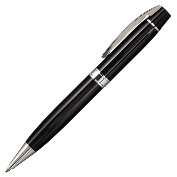 Elegant metallpenna i högblank svart lack med kromade detaljer. En tung och ståtlig metallpenna som utstrålar både stil och kvalitet. Den högblanka svarta lacken kombineras med eleganta kromade detaljer och ett fjädrande klips som ger pennan en exklusiv känsla. Den ligger skönt i handen och ger en professionell framtoning vid varje skrivtillfälle. Perfekt som present eller exklusiv profilprodukt.